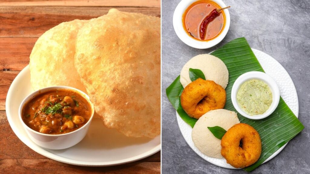 - North India: Common breakfast items include stuffed parathas, puris with aloo sabzi, and chole bhature.